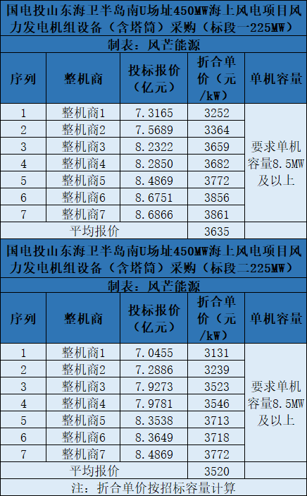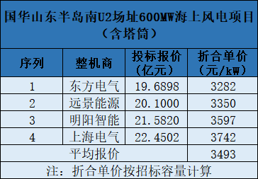 上次行業(yè)刷新低價是在國家能源集團(tuán)國華投資山東半島南U2場址600MW海上風(fēng)機(jī)(含塔筒)采購項(xiàng)目。該項(xiàng)目共有4家整機(jī)商競標(biāo),其中東方電氣報(bào)價最低,投標(biāo)報(bào)價為19.69億元,折合單價為3282元/kW。