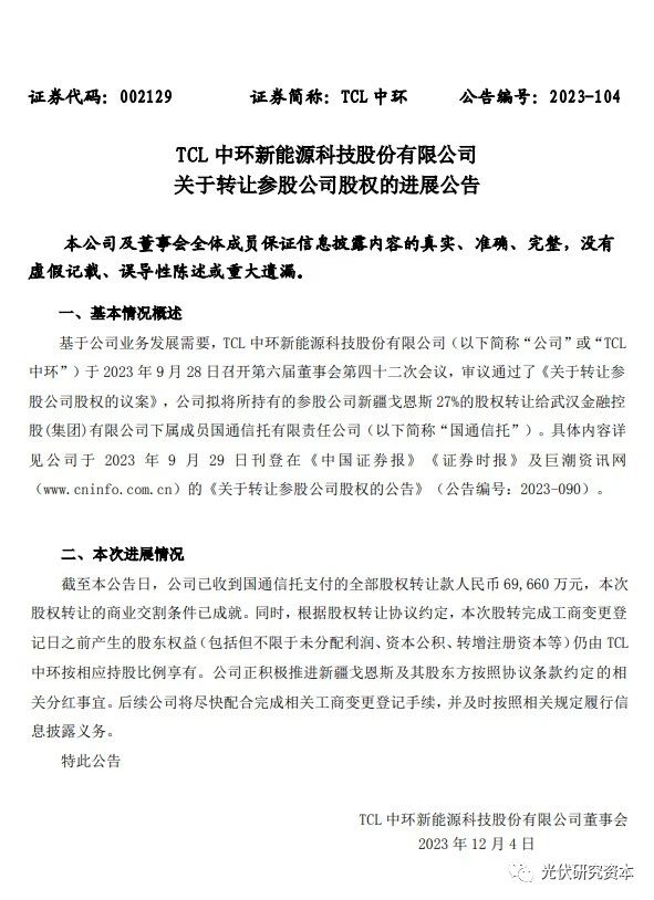 12月4日消息, TCL中環(huán)發(fā)布公告稱,公司已成功轉(zhuǎn)讓其所持有的新疆戈恩斯27%的股權(quán)給武漢金融控股(集團(tuán))有限公司下屬的國(guó)通信托有限責(zé)任公司,并已收到全部股權(quán)轉(zhuǎn)讓款人民幣6.97億元。根據(jù)股權(quán)轉(zhuǎn)讓協(xié)議,TCL中環(huán)在完成工商變更登記日之前仍享有相應(yīng)股東權(quán)益。公司目前正在積極推進(jìn)分紅事宜,并將盡快完成相關(guān)工商變更登記手續(xù)。