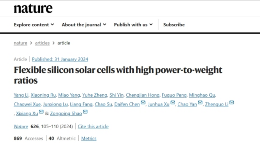 近日,隆基綠能與江蘇科技大學、澳大利亞科廷大學三方合作,在國際上首次制造出高柔韌性、高功率重量比的晶硅異質結太陽能電池,相關研究成果以“Flexible silicon solar cells with high power-to-weight ratios”為題發(fā)表在國際期刊《Nature》(自然)上。