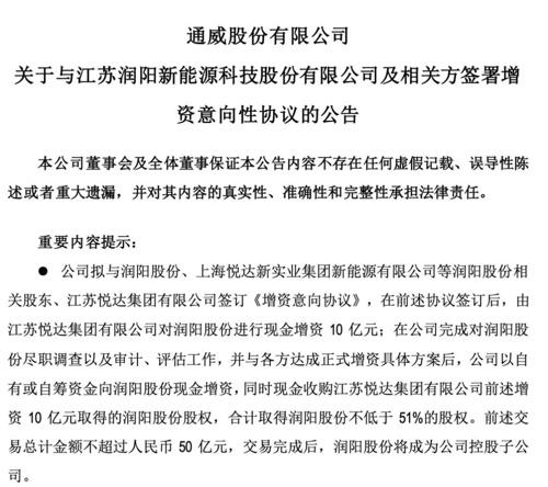 據(jù)公告顯示,在前述協(xié)議簽訂后,由江蘇悅達(dá)集團(tuán)有限公司對(duì)潤陽股份進(jìn)行現(xiàn)金增資10億元;在通威股份完成對(duì)潤陽股份盡職調(diào)查以及審計(jì)、評(píng)估工作,并與各方達(dá)成正式增資具體方案后,公司以自有或自籌資金向潤陽股份現(xiàn)金增資,同時(shí)現(xiàn)金收購悅達(dá)集團(tuán)前述增資10億元取得的潤陽股份股權(quán),合計(jì)取得潤陽股份不低于51%的股權(quán)。