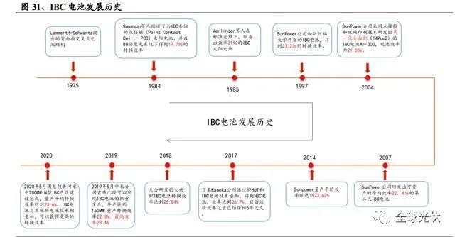 IBC 電池發(fā)展歷史:IBC 電池早最是由 Lammert 和 Schwartz 在 1975 年提出 的背面指交叉式電池結(jié)構(gòu)。美國的 Sunpower 公司是 IBC 電池的領(lǐng)軍者和開拓者, 2014 年其量產(chǎn)平均效率就達(dá)到 23.62%,2015 年實(shí)驗(yàn)室效率達(dá)到 25.2%;2018 年 天合研發(fā)的大面積 IBC 電池轉(zhuǎn)換效率達(dá)到 25.04%;2019 年 5 月中來公司宣布已 經(jīng)可以實(shí)現(xiàn) IBC 電池的批量生產(chǎn),年產(chǎn)能約 150MW,量產(chǎn)轉(zhuǎn)換效率 22.8%,最高效率 23.4%。2020 年 5 月國電投黃河水電 200MW N 型 IBC 產(chǎn)線建設(shè)完成,量產(chǎn)平均轉(zhuǎn)換效率達(dá)到 23.6%。IBC 電池與其他新電池技術(shù)相疊加,可以獲得更高的 轉(zhuǎn)換效率,2017 年 3 月,日本 Kaneka 公司通過將 HJT 和 IBC 電池技術(shù)疊加,得 到 HBC 電池,效率達(dá)到 26.7%,目前這項(xiàng)效率記錄已經(jīng)保持 5 年之久。