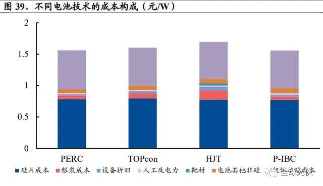 硅片端:硅片端成本差異主要來源于基地材料的選擇和硅片的厚度。硅片材料方面 TOPcon 和 HJT 使用 N 型硅片,PERC 和 P-IBC 使用 P 型硅片,硅片厚 度方面 TOPcon, PERC, P-IBC 均采用高溫工藝,使用厚度為 160μm 的硅片,HJT 低溫工藝可使用150μm硅片。N型硅片價(jià)格較P型高5-8%,則PERC,TOPcon, HJT,P-IBC 硅片端成本分別為 0.78、0.80、0.78、0.77 元/W。