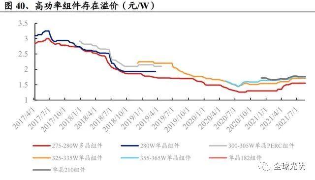 從最終組件端綜合成本來看,當(dāng)前 P-IBC 電池已經(jīng)具備成本優(yōu)勢,TOPcon 成本較 PERC 稍高,HJT 電池成本還需進(jìn)一步下降。溢價(jià):TOPcon 高效組件產(chǎn)品溢價(jià)約為 0.1 元/W。新型產(chǎn)品性價(jià)比除了考慮 絕對成本優(yōu)勢外,還需考慮高功率溢價(jià)優(yōu)勢。參考PVinfolink數(shù)據(jù),2017-2020年 間,單晶組件相對于多晶組件長期保持 8%-10%的價(jià)格溢價(jià),大尺寸(182及 210) 高功率組件產(chǎn)品相對于常規(guī)功率組件也能保持一定溢價(jià)。