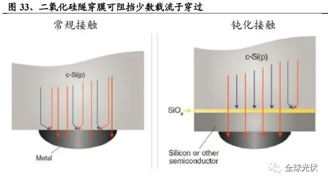 二氧化硅+摻雜多晶硅:隧穿作用和鈍化作用。二氧化硅隧穿膜最佳厚度在 1.2nm,其作用在于使多數(shù)載流子(電子)通過隧穿效應(yīng)穿過氧化層,但少數(shù)載流 子(空穴)被阻擋,從而進(jìn)一步降低了載流子復(fù)合效應(yīng)。摻雜多晶硅層一方面起到保護(hù)二氧化硅層的作用,另一方面會(huì)增加電子或空穴在氧化硅中的隧穿概率, 因此,多晶硅層的摻雜濃度越高,太陽能電池的開路電壓和效率就越高。
