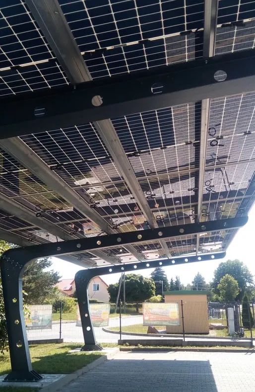 作為歐洲光伏需求旺盛的市場,波蘭早就將“光伏+車棚”滲透于應(yīng)用當(dāng)中,出現(xiàn)了一個個“綠色”車棚的身影。中來JW-HD144N高功率、高性價比的雙面組件替代了傳統(tǒng)車棚的膜結(jié)構(gòu)鋼頂,不僅可以遮風(fēng)擋雨、節(jié)能環(huán)保而且實(shí)用性強(qiáng),深藍(lán)色的光伏電板在陽光下熠熠生輝,為當(dāng)?shù)卦鎏砹艘坏懒聋惖娘L(fēng)景。
