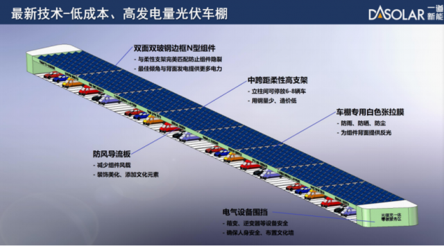 在第六屆分布式能源嘉年華上,一道新能源系統(tǒng)工程創(chuàng)新研究院院長韓利生分享了零碳服務(wù)區(qū)的光儲充一體化停車場解決方案。他表示一道新能推出的停車區(qū)光伏解決方案,以高效、美觀、便捷為理念,對于常規(guī)停車棚造價高、發(fā)電量低、設(shè)計感缺失等缺點進行了針對性優(yōu)化。首先,采用中跨距柔性高支架代替常規(guī)短跨距鋼架式結(jié)構(gòu),降低了造價,同時為N型雙面鋼邊框組件提供最佳傾角,確保整面發(fā)電量最優(yōu);其次,布置白色張拉膜作為防曬防雨材料,并利用其反光特性,增加雙面組件的背面發(fā)電量;最后,采用防風(fēng)導(dǎo)流板、安全隔離護板等結(jié)構(gòu),將光伏組件迎風(fēng)面和地面電氣設(shè)備保護起來,既提高了安全性、又增加了美觀性。