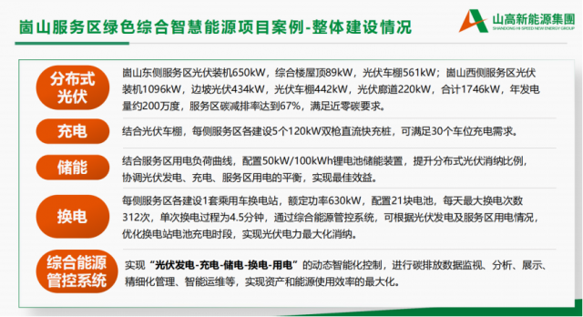 舉例來說,崮山服務(wù)案區(qū)綠色綜合智慧能源項目位于濟南長清區(qū)京臺高速段,占地約260 畝,其中,東側(cè)服務(wù)區(qū)較為狹長,西側(cè)服務(wù)區(qū)背靠崮 云湖,周邊旅游資源豐富,西側(cè)服務(wù)區(qū)內(nèi)已建成酒店和觀光廊道。崮山服務(wù)區(qū)年用電量約300萬度,折合年碳排放量約2653噸,服務(wù)區(qū)當(dāng)前變壓器總?cè)萘繛?500kVA。崮山服務(wù)區(qū)已建成充電樁共8個、污水處理設(shè)施、多聯(lián)機中央空調(diào)系統(tǒng)等,本次建設(shè)內(nèi)容包括分布式光伏、 儲能、充電站、換電站、綜合能源管理系統(tǒng)等。實現(xiàn)“光伏發(fā)電-充電-儲電-換電-用電”的動態(tài)智能化控制,進行碳排放數(shù)據(jù)監(jiān)視、分析、展示、精細(xì)化管理、智能運維等,實現(xiàn)資產(chǎn)和能源使用效率的最大化。