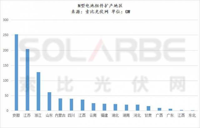 索比光伏網(wǎng)據(jù)公開數(shù)據(jù)統(tǒng)計(jì),2022年至今,各光伏企業(yè)發(fā)布的N型電池組件擴(kuò)產(chǎn)計(jì)劃超900GW,其中超600GW為電池,投資金額超4200億元,有超200GW預(yù)計(jì)在2023年投產(chǎn)。擴(kuò)產(chǎn)企業(yè)有60家左右,其中20家為跨界光伏企業(yè),擴(kuò)產(chǎn)規(guī)模占比近三成。從地區(qū)分布看,安徽、江浙地區(qū)的區(qū)位條件、營商環(huán)境吸引了最多企業(yè)的目光。
