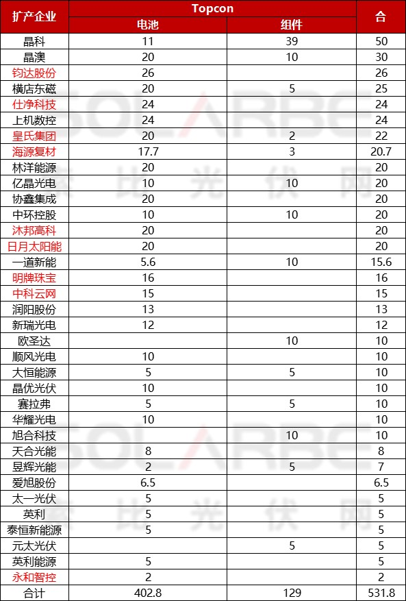 Topcon方面,2022年至今各家企業(yè)已發(fā)布超過530GW的電池、組件擴(kuò)產(chǎn)計(jì)劃,其中擴(kuò)產(chǎn)規(guī)模超10GW的企業(yè)就有26家。詳情見下: