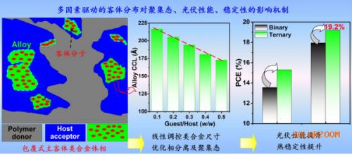 進一步,研究對外圍功能化的客體分子主骨架進行再調控,獲得了高質量的類合金體相,同時,類合金聚集體的晶域尺寸可以通過客體摻雜比例進行線性調控(圖2)。相比受體相內同時存在客體自聚集區(qū)域及類合金區(qū)域,該研究中客體分子與主體受體具有高度兼容性。實驗結果分析顯示幾乎所有的客體分子均參與類合金體相的構建,這是類合金晶域尺寸可以線性調控的本質原因。同時,客體分子摻雜后,無論是主體聚合物給體還是主體受體的結晶性均得到增強,促進了垂直方向空穴和電子的傳輸。此外,客體分子形成的類合金聚集體均包覆在主體受體相內,形成了核殼結構(主體包覆客體),增強了主客體之間的能量轉移。對于這種獨特的聚集態(tài)結構,研究首次提出了具有普適性的主客體結晶性、表面能、兼容性相互關系以及給受體相互作用四要素協(xié)同作用的驅動機制。此類獨特的主客體聚集態(tài)及分子堆積,對于提高電荷傳輸、抑制電荷復合起到重要作用。研究將其作為客體分子進行摻雜,在多個體系中實現(xiàn)了超過80%的填充因子(最高達到81.1%)和19.2%的高能量轉換效率。除了效率提升外,研究再次發(fā)現(xiàn)類合金體相的形成明顯改善了OSC的穩(wěn)定性,驗證了類合金體相對抑制亞穩(wěn)態(tài)形成、提高光伏電池穩(wěn)定性的作用。