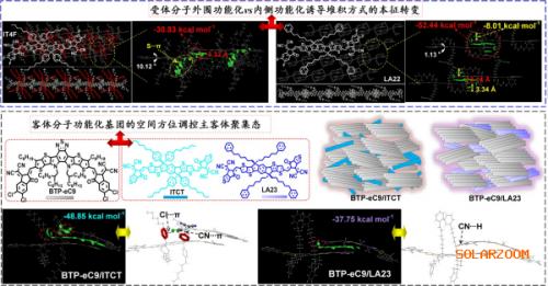 該研究優(yōu)化受體分子側鏈功能基團的位置(圖1),將face-to-face/face-to-edge混合取向堆積的客體分子轉換為100% face-to-face優(yōu)勢取向,提高了垂直方向的電子傳輸性能。單晶解析和相關理論分析發(fā)現(xiàn),側鏈外圍功能化的分子可以通過外圍共軛平臺與相鄰受體分子骨架形成緊密的π-π相互作用,使分子取向實現(xiàn)定向錨定。而相對于功能化基團在內側的客體分子,外圍功能化的客體與主體受體之間形成類合金聚集態(tài),呈現(xiàn)出更為規(guī)整的分子排列與取向,降低了受體相內的缺陷密度及復合損失。摻雜后的OSC光伏效率達到19.12%,且類合金體相在熱力學上更趨向于平衡態(tài),OSC的熱穩(wěn)定性得到明顯提升。因此,調控摻雜客體分子的堆積取向及主客體相互作用,對獲得合適相分離、抑制亞穩(wěn)態(tài)生成、提升光伏電池穩(wěn)定性具有積極作用。