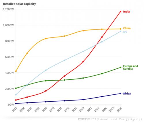 近年來(lái),印度光伏市場(chǎng)發(fā)展迅速,光伏裝機(jī)始終保強(qiáng)勁增長(zhǎng)。截至2023年6月30日,印度可再生能源發(fā)電的累計(jì)裝機(jī)容量達(dá)到129.6GW,太陽(yáng)能約占可再生能源總裝機(jī)容量的54%。美國(guó)能源信息署(IEA) 《國(guó)際能源展望》報(bào)告預(yù)測(cè)稱(chēng),至2050年,印度的太陽(yáng)能裝機(jī)容量將在全球占據(jù)主導(dǎo)地位。