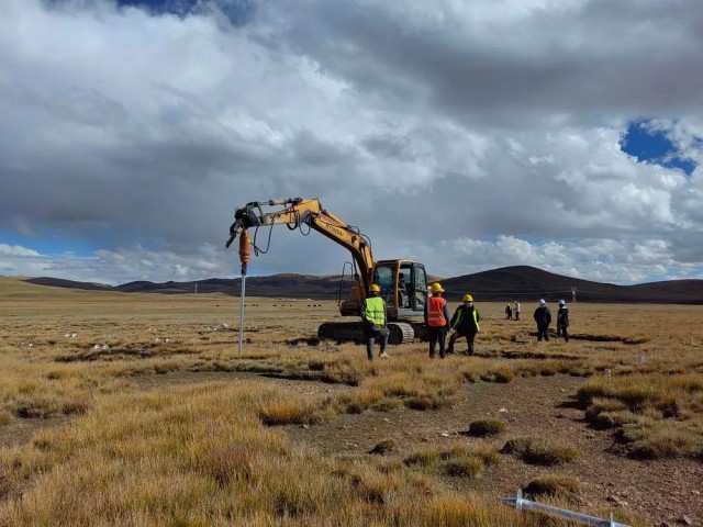 在西藏華電那曲色尼區(qū)12萬千瓦光伏發(fā)電電力保供項(xiàng)目工地,工人們正安裝螺旋樁。