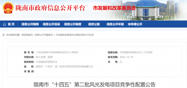 12月16日,隴南市發(fā)布“十四五”第二批風(fēng)光發(fā)電項目競爭性配置公告。