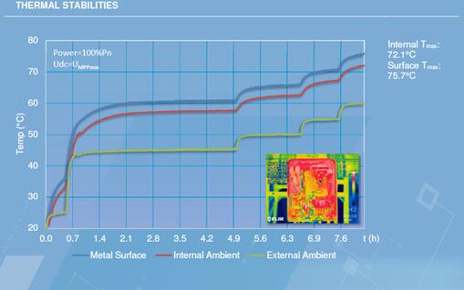 代表機型2:S廠商逆變器。逆變器內(nèi)部溫度比機箱外殼溫度高15度左右,在環(huán)境溫度45度條件下,內(nèi)部溫度約70度;