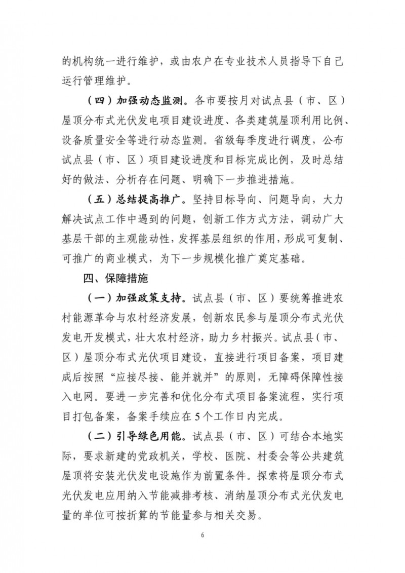 為促進我省整縣屋頂分布式光伏項目建設(shè),省級將建立按月調(diào)度機制,對試點地區(qū)各類屋頂分布式光伏發(fā)電項目備案、開工、建設(shè)和并網(wǎng)情況等進行全過程監(jiān)測,按季度公布相關(guān)信息。非試點縣(市、區(qū))要按既有相關(guān)政策規(guī)定繼續(xù)開展各類屋頂分布式光伏發(fā)電項目開發(fā)建設(shè)。2023年底前,試點縣(市、區(qū))各類屋頂安裝光伏發(fā)電的比例均達到國家相關(guān)要求的,我委將申請列為國家整縣(市、區(qū))屋頂分布式光伏開發(fā)示范縣。試點中發(fā)現(xiàn)的亮點和存在的突出問題,請及時報送我委。