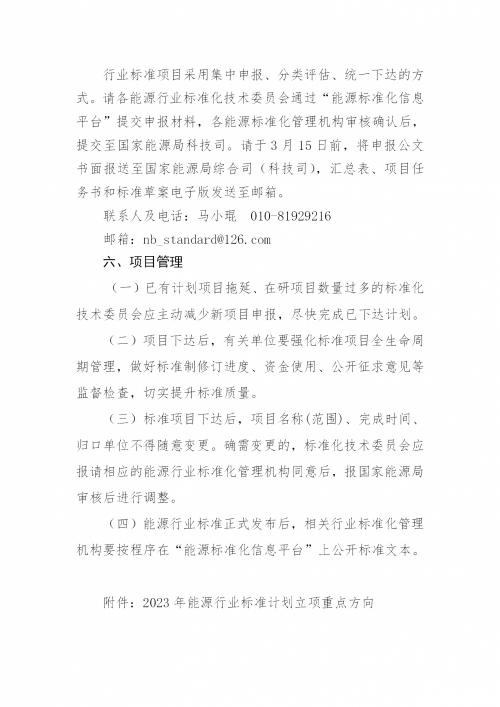 為進一步提升能源行業(yè)標準立項工作的計劃性、導(dǎo)向性,根據(jù)國家能源局標準化工作安排,結(jié)合落實《能源碳達峰碳中和標準化提升行動計劃》重點任務(wù),我局組織編制了《2023年能源行業(yè)標準計劃立項指南》?,F(xiàn)印發(fā)給你們,請按照指南明確的要求,做好能源行業(yè)標準計劃立項工作。