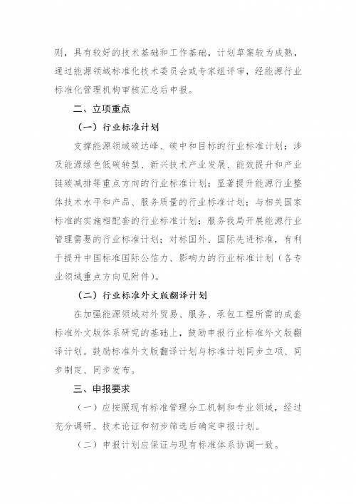 文件明確,突出能源行業(yè)標準的公益性,對沒有國家標準而又需要在能源行業(yè)范圍內(nèi)統(tǒng)一的,提出能源行業(yè)標準計劃。屬于競爭性的、一般性的技術(shù)要求,原則上不作為能源行業(yè)標準計劃。