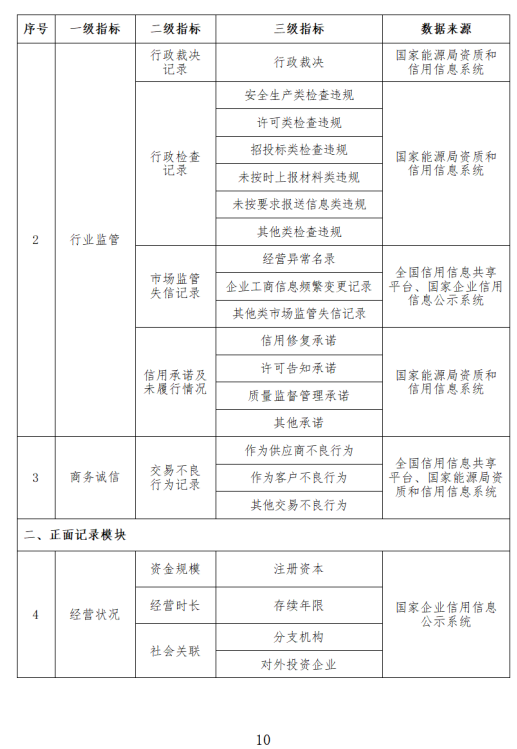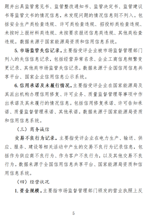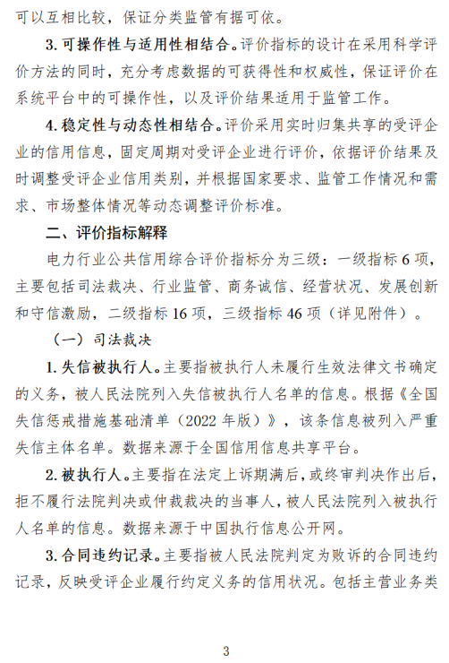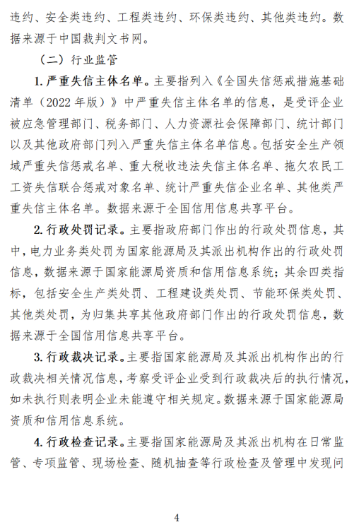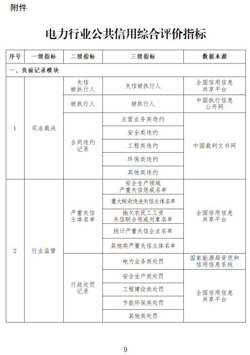 近日,國(guó)家能源局印發(fā)《電力行業(yè)公共信用綜合評(píng)價(jià)標(biāo)準(zhǔn)(試行)》的通知(國(guó)能發(fā)資質(zhì)規(guī)〔2023〕28號(hào)),明確提出“電力行業(yè)公共信用綜合評(píng)價(jià)指標(biāo)分為三級(jí):一級(jí)指標(biāo)6項(xiàng),主要包括司法裁決、行業(yè)監(jiān)管、商務(wù)誠(chéng)信、經(jīng)營(yíng)狀況、發(fā)展創(chuàng)新和守信激勵(lì),二級(jí)指標(biāo)16項(xiàng),三級(jí)指標(biāo)46項(xiàng)”。原文如下: