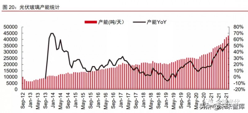 光伏玻璃供需格局趨于寬松,2022年名義產(chǎn)能或面臨過(guò)剩壓力。在經(jīng)歷2020Q4光伏玻璃“一平難求”的火爆行情后,由于產(chǎn)能加快擴(kuò)張及下游需求增速放緩,2021年光伏玻璃供需格局出現(xiàn)明顯倒轉(zhuǎn),供給整體相對(duì)充裕,預(yù)計(jì)年底產(chǎn)能將增至4.35萬(wàn)噸/天(+52%YoY),但Q4受需求旺季拉動(dòng)供給或出現(xiàn)階段性趨緊。而預(yù)計(jì)2022年行業(yè)產(chǎn)能仍持續(xù)較快擴(kuò)張,至年底產(chǎn)能將達(dá)6.9萬(wàn)噸/天(+59%YoY)。在2022年全球裝機(jī)210GW左右的預(yù)期下,考慮雙玻滲透率穩(wěn)步提升,預(yù)計(jì)光伏玻璃熔化量需求約1313萬(wàn)噸,而行業(yè)有效產(chǎn)能或超2000萬(wàn)噸,光伏玻璃或?qū)⒚媾R名義產(chǎn)能過(guò)剩壓力。