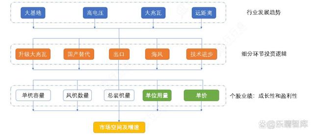 風(fēng)電行業(yè)的發(fā)展趨勢(shì)主要包括大兆瓦、高電壓、大基地和遠(yuǎn)距離,細(xì)分環(huán)節(jié)的邏輯主要從“升級(jí)大兆瓦+國(guó)產(chǎn)替代+出口+海風(fēng)+技術(shù)進(jìn)步”等五個(gè)方面去篩選。主要從量和價(jià)兩個(gè)方面判斷其未來(lái)的市場(chǎng)空間。