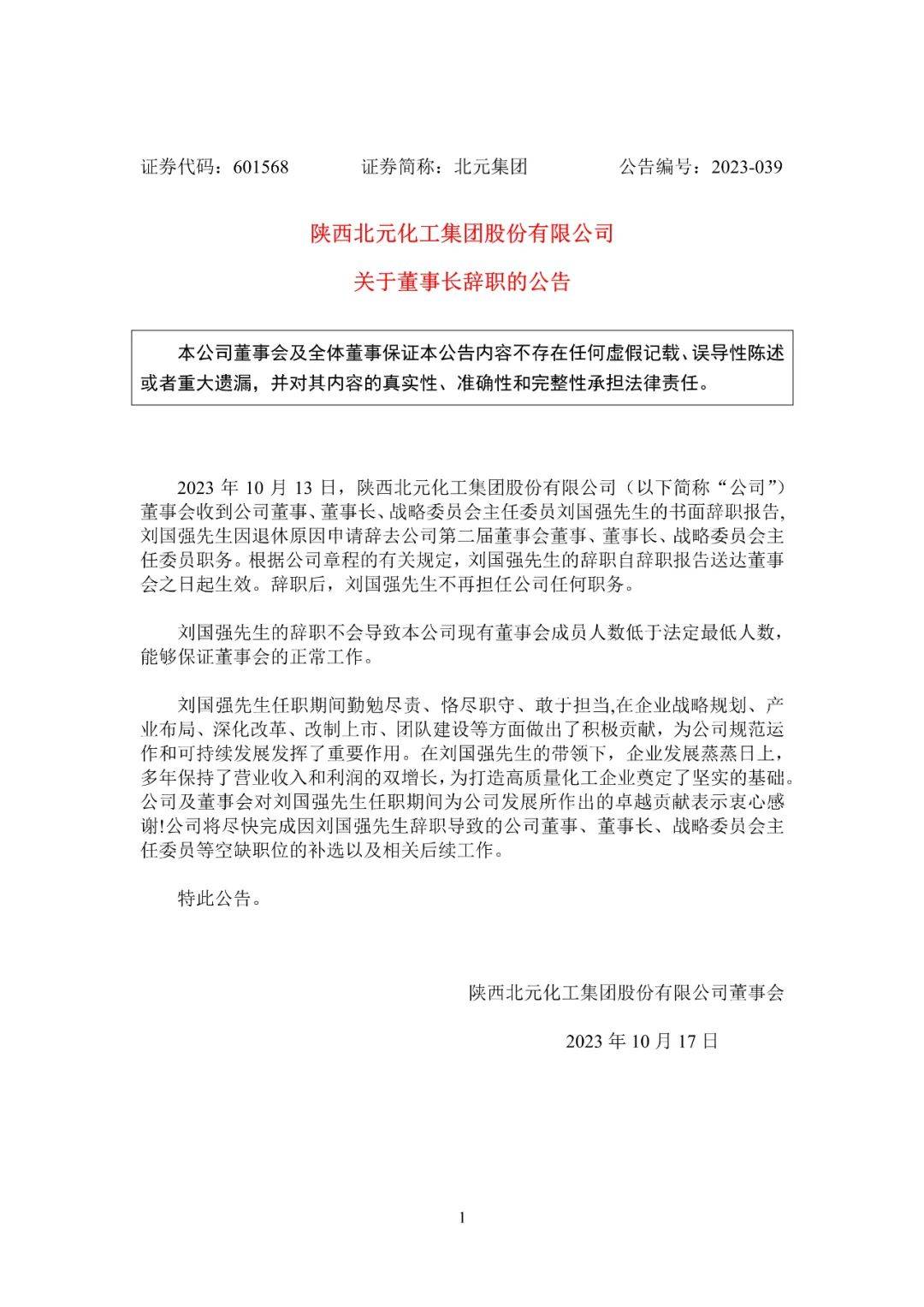 北元集團(tuán)10月16日發(fā)布公告稱,10月13日,公司董事會收到董事、董事長、戰(zhàn)略委員會主任委員劉國強(qiáng)先生的書面辭職報告, 劉國強(qiáng)因退休原因申請辭去公司第二屆董事會董事、董事長、戰(zhàn)略委員會主任委員職務(wù)。