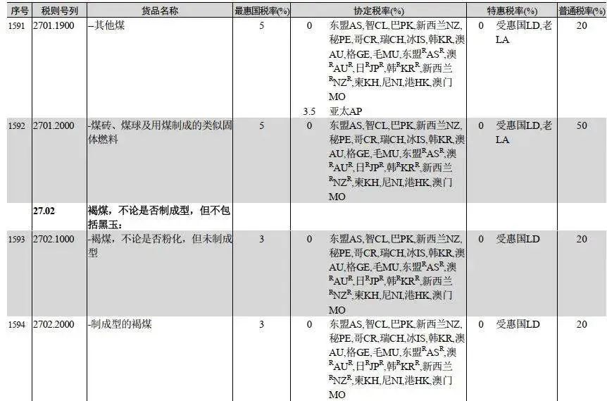 稅則顯示,2024年1月1日起,恢復(fù)煤炭進口關(guān)稅。普通稅率為20%;特惠稅率為0;協(xié)定稅率基本為0;最惠國稅率中,無煙煤、煉焦煤、褐煤為3%,其他煤為6%。