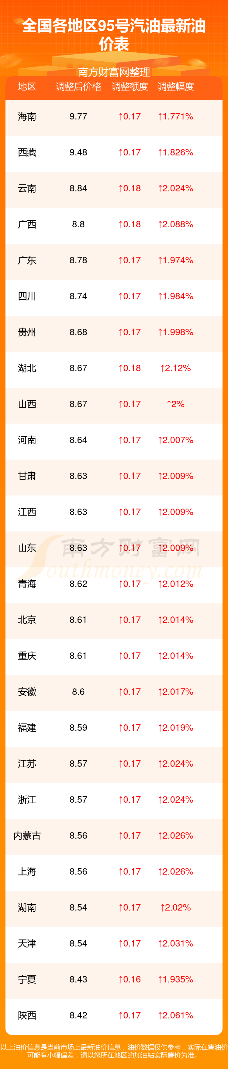 全國各地區(qū)最新95號(hào)汽油油價(jià)表