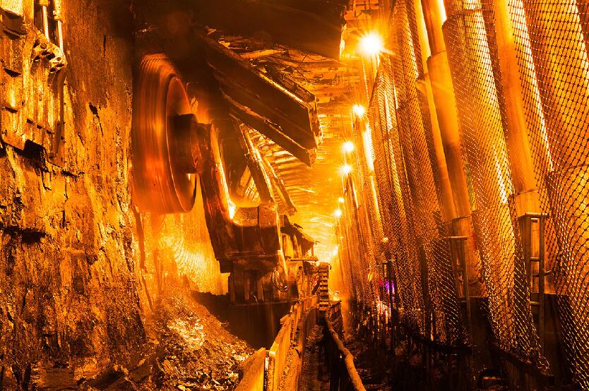 在井道中行駛20多分鐘,就到達(dá)了8.8米超大采高智能綜采工作面。只見直徑3.5米的兩只滾筒式采煤刀一前一后、一上一下,在接近3層樓高的煤壁上垂直飛旋,煤刀的刀頭異常鋒利,所到之處煤塊紛紛落下。一刀從機(jī)頭割到機(jī)尾,就是3000噸煤,這是常規(guī)工作面開采的兩倍。