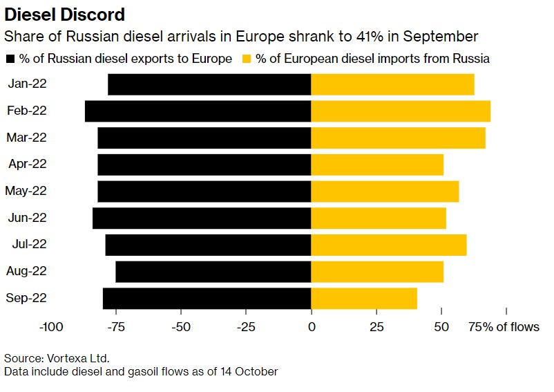 柴油市場的現(xiàn)狀可能會給柏林、巴黎市場敲響警鐘。就在上個(gè)月,歐洲五分之二的柴油進(jìn)口來自俄羅斯。就俄羅斯而言,它仍在將約80%的燃料運(yùn)往歐洲。