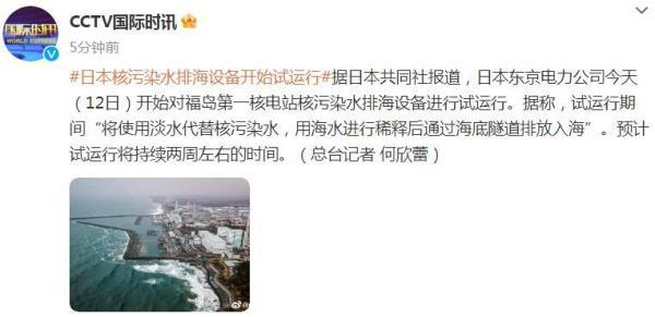 據(jù)日本共同社報道,日本東京電力公司今天(6月12日)開始對福島第一核電站核污染水排海設(shè)備進行試運行。據(jù)稱,試運行期間“將使用淡水代替核污染水,用海水進行稀釋后通過海底隧道排放入海”。預(yù)計試運行將持續(xù)兩周左右的時間。
