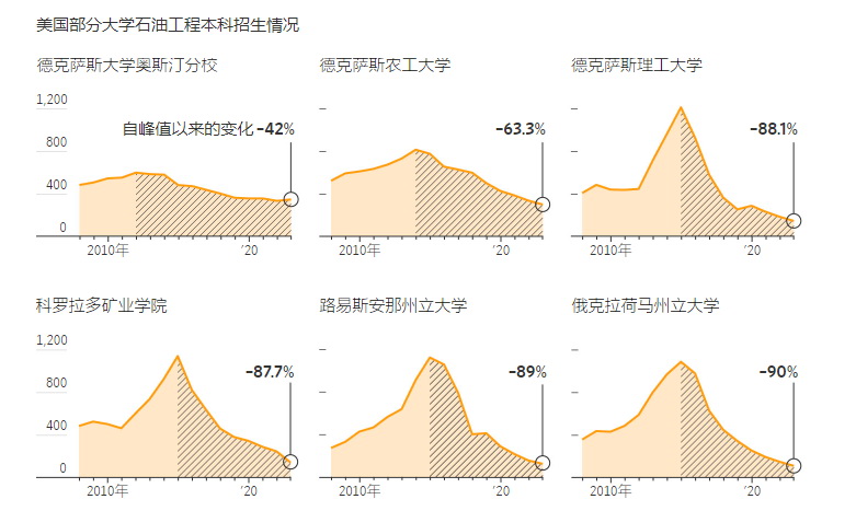 在美國(guó)的大學(xué)里,石油工程專業(yè)的新生人數(shù)已經(jīng)減少到10多年前水力壓裂熱潮開始前的最低水平。歐洲的大學(xué)過(guò)去曾為在中東和亞洲開展能源業(yè)務(wù)的公司培育了許多工程師,但現(xiàn)在也已看到了類似的降溫趨勢(shì)!