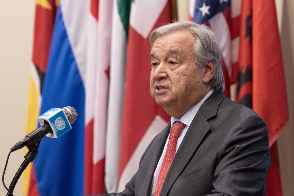 當(dāng)?shù)貢r(shí)間2023年10月13日,美國(guó)紐約,聯(lián)合國(guó)秘書長(zhǎng)古特雷斯在聯(lián)合國(guó)總部向媒體發(fā)表關(guān)于中東局勢(shì)的聲明。