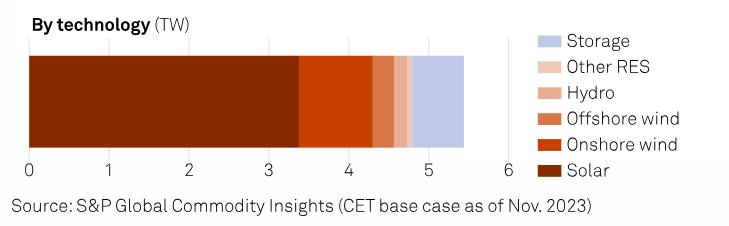 根據(jù)該項(xiàng)承諾,全球可再生能源的目標(biāo)將需要前所未有的加速部署。目前風(fēng)能和太陽能的全球總裝機(jī)容量為2.3太瓦(TW,1TW相當(dāng)于1000個(gè)吉瓦),根據(jù)標(biāo)準(zhǔn)普爾全球商品洞察的分析,從現(xiàn)在到2030年,預(yù)計(jì)全球?qū)⒃黾蛹s4.6太瓦的太陽能和風(fēng)能容量,耗資4.7萬億美元。