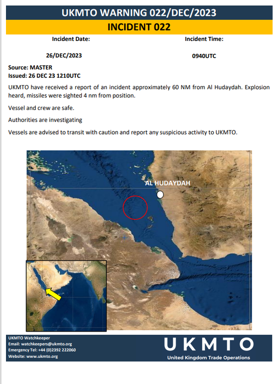 通報(bào)顯示,爆炸發(fā)生的大概位置在距離也門西海岸荷臺(tái)達(dá)港約60海里(約111公里)的紅海海域,距離報(bào)告本次事件的船只約8公里。英國海上貿(mào)易行動(dòng)辦公室表示,這艘船在26日航行時(shí)看到事發(fā)地點(diǎn)出現(xiàn)了2架無人機(jī)和導(dǎo)彈(或指發(fā)射物),隨后聽到了爆炸聲。報(bào)道稱,無人機(jī)沒有裝載武器,目前尚不清楚爆炸的具體原因。