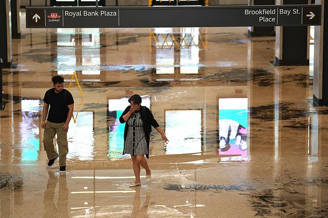 7月16日,加拿大多倫多的大部分火車因洪水延誤,乘客們走過車站。
