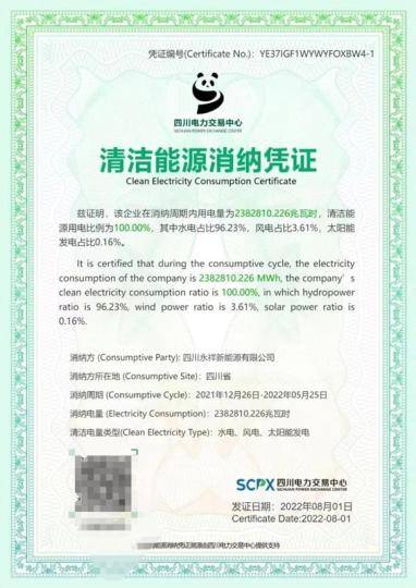 近年來(lái),國(guó)網(wǎng)四川省電力公司按照“強(qiáng)電網(wǎng)、快建設(shè)、優(yōu)服務(wù)”工作主線,為包括永祥新能源有限公司在內(nèi)的樂(lè)山“中國(guó)綠色硅谷”建設(shè)提供了堅(jiān)強(qiáng)的電力要素保障。此次清潔能源消納憑證的頒發(fā),更讓硅谷“綠色”有據(jù)可依,有跡可循。 “2022年上半年,企業(yè)用電量接近30億千瓦時(shí),其中水電、風(fēng)電、太陽(yáng)能發(fā)電生產(chǎn)的清潔電力占比100%,這次頒發(fā)的清潔能源消納憑證,完整展示了企業(yè)消費(fèi)清潔電力的全過(guò)程信息,也支持二維碼溯源查詢。”四川永祥股份有限公司電力總監(jiān)張鋅稱。8月起,凡是參與到四川省電力市場(chǎng)化交易的企業(yè)均可在四川電力交易平臺(tái)申請(qǐng)領(lǐng)取清潔能源消納憑證,四川電力交易中心將按照相關(guān)規(guī)定,給符合申請(qǐng)要求的企業(yè)發(fā)放該憑證為企業(yè)綠色低碳發(fā)展保駕護(hù)航,為國(guó)家“雙碳”目標(biāo)實(shí)現(xiàn)注入新活力。