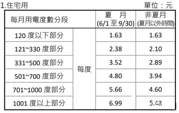 一般家庭由于用電量較少且低谷時段(22:30-07:30)用電量不多,故多采用階梯電價計費。以夏月為例,假設(shè)每月用電433度,其中的120度每度電價為1.63元新臺幣(與非夏月單價一致),121度-330度部分對應(yīng)每度2.38元新臺幣,剩余103度對應(yīng)3.52元新臺幣,逐級增加。簡言之,用電量越大、單價越高。