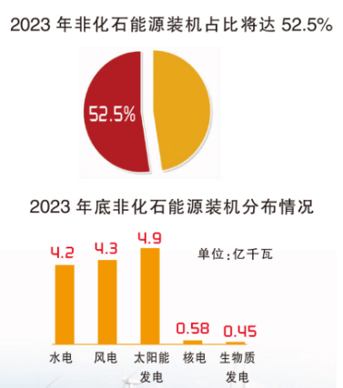 《報(bào)告》預(yù)計(jì),在新能源發(fā)電快速發(fā)展帶動(dòng)下,2023年新投產(chǎn)的總發(fā)電裝機(jī)以及非化石能源發(fā)電裝機(jī)規(guī)模將再創(chuàng)新高,其中全國(guó)新增發(fā)電裝機(jī)規(guī)模有望達(dá)到2.5億千瓦左右,新增非化石能源發(fā)電裝機(jī)1.8億千瓦。到2023年底,全國(guó)發(fā)電裝機(jī)達(dá)28.1億千瓦左右,非化石能源發(fā)電裝機(jī)合計(jì)14.8億千瓦,占總裝機(jī)比重上升至52.5%左右。其中,水電4.2億千瓦、并網(wǎng)風(fēng)電4.3億千瓦、并網(wǎng)太陽(yáng)能發(fā)電4.9億千瓦、核電5846萬(wàn)千瓦、生物質(zhì)發(fā)電4500萬(wàn)千瓦左右,太陽(yáng)能發(fā)電及風(fēng)電裝機(jī)規(guī)模將在2023年首超水電裝機(jī)規(guī)模 。