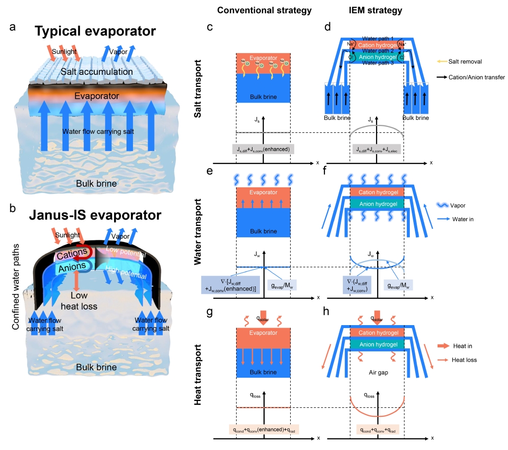 太陽(yáng)能界面蒸發(fā)是一種新興的海水淡化技術(shù),其將蒸發(fā)器漂浮于海面上進(jìn)行界面光熱蒸發(fā),具有綠色、零能耗、低成本和結(jié)構(gòu)簡(jiǎn)單等諸多優(yōu)勢(shì),有望解決全球性淡水短缺問題。但光熱表面水汽化會(huì)造成鹽分積累,嚴(yán)重阻礙其長(zhǎng)期運(yùn)行的穩(wěn)定性。將光熱層疏水化和強(qiáng)化對(duì)流傳質(zhì)是當(dāng)前抗積鹽的主要方法。前者避免海水到達(dá)光熱層來防止積鹽,但其同時(shí)增大了光熱層與海水之間的熱阻,降低蒸發(fā)速率。后者加快水對(duì)流從蒸發(fā)表面帶走鹽分,但同時(shí)也帶走了熱量,制約蒸發(fā)速率。因此,傳統(tǒng)方法無法解決鹽離子運(yùn)移和高效熱利用之間的矛盾,積鹽問題仍是界面蒸發(fā)所面臨的最嚴(yán)峻挑戰(zhàn)之一。