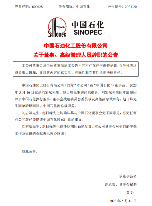 5月16日,中國石化發(fā)布公告,中國石油化工股份有限公司董事會(huì)于5月16日收到劉宏斌先生、趙日峰先生的辭職報(bào)告,劉宏斌先生因年齡原因辭去中國石化執(zhí)行董事、董事會(huì)戰(zhàn)略委員會(huì)委員以及高級(jí)副總裁職務(wù),趙日峰先生因年齡原因辭去中國石化副總裁職務(wù)。