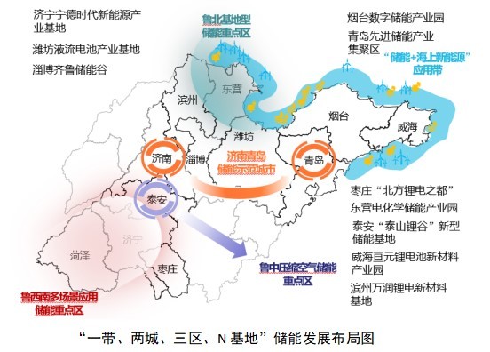 2022年底,《山東省新型儲(chǔ)能工程發(fā)展行動(dòng)方案》正式印發(fā)。其中明確,山東將著力構(gòu)建“一帶、兩城、三區(qū)、N基地”發(fā)展格局,包括:打造“儲(chǔ)能+海上新能源”應(yīng)用帶,建設(shè)濟(jì)南、青島儲(chǔ)能示范城市,構(gòu)建魯北、魯中、魯西多個(gè)儲(chǔ)能重點(diǎn)區(qū),培育一批特色鮮明的產(chǎn)業(yè)基地,實(shí)現(xiàn)新型儲(chǔ)能由商業(yè)化初期向規(guī)模化發(fā)展轉(zhuǎn)變。