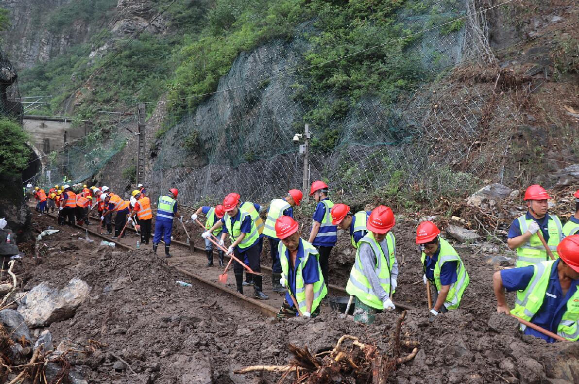 7月30日,受北京特大暴雨影響,三輛列車受困??吭诒本╅T頭溝妙峰山鎮(zhèn)山區(qū)。由于交通完全阻隔,災(zāi)情仍在持續(xù),現(xiàn)場救援刻不容緩。8月1日晚上9點半,接上級通知,中鐵十四局京唐、石港、雄商、雄忻、津滄等北京周邊項目共275人連夜趕赴北京門頭溝搶險一線,搶修被山體沖刷的淤泥、樹根、巨石覆蓋的鐵路路基,為受困列車旅客拉通逃生通道。