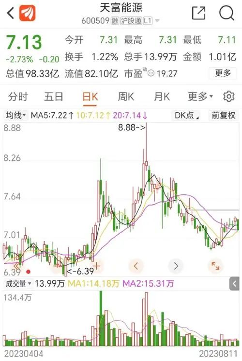 目前,天富能源股價為7.13元,總市值約為98億元。