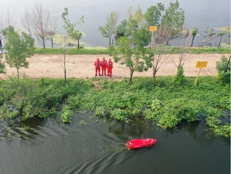 8月5日,天津靜海大清河,技術(shù)人員利用無(wú)人偵測(cè)船不間斷監(jiān)測(cè)水情,探測(cè)水下地形地物,快速準(zhǔn)確獲取水下堆體數(shù)據(jù)及模型……