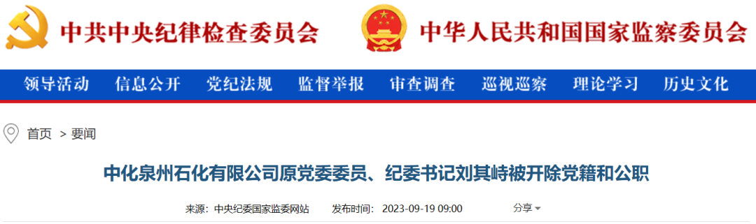 中央紀(jì)委國家監(jiān)委網(wǎng)站9月19日消息,據(jù)中國中化控股有限責(zé)任公司紀(jì)檢監(jiān)察組、福建省紀(jì)委監(jiān)委消息:日前,中國中化控股有限責(zé)任公司紀(jì)檢監(jiān)察組、福建省泉州市監(jiān)委對中化泉州石化有限公司原黨委委員、紀(jì)委書記劉其峙嚴(yán)重違紀(jì)違法問題進(jìn)行了紀(jì)律審查和監(jiān)察調(diào)查。