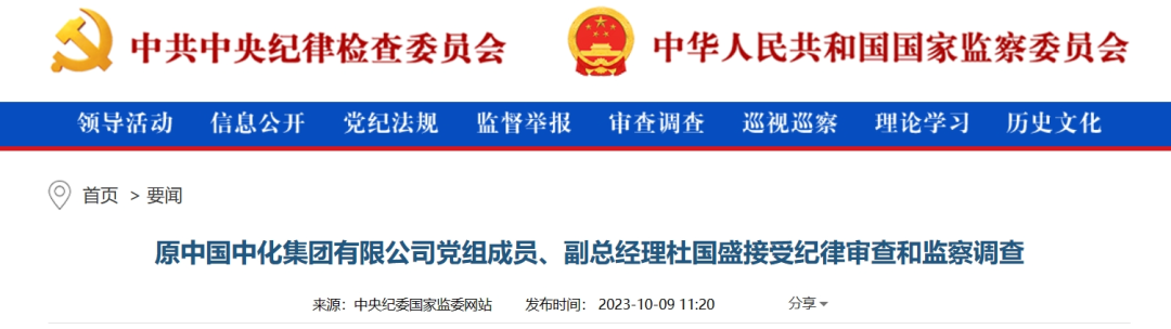 中央紀(jì)委國家監(jiān)委網(wǎng)站10月9日消息,據(jù)中國中化控股有限責(zé)任公司紀(jì)檢監(jiān)察組、福建省紀(jì)委監(jiān)委消息:原中國中化集團(tuán)有限公司黨組成員、副總經(jīng)理杜國盛涉嫌嚴(yán)重違紀(jì)違法,目前正接受中國中化控股有限責(zé)任公司紀(jì)檢監(jiān)察組和福建省泉州市監(jiān)委紀(jì)律審查和監(jiān)察調(diào)查。