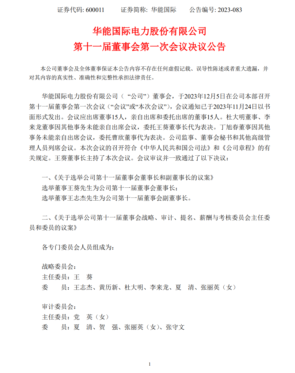 12月6日,華能國際發(fā)布《華能國際電力股份有限公司第十一屆董事會第一次會議決議公告》(以下簡稱《公告》)。
