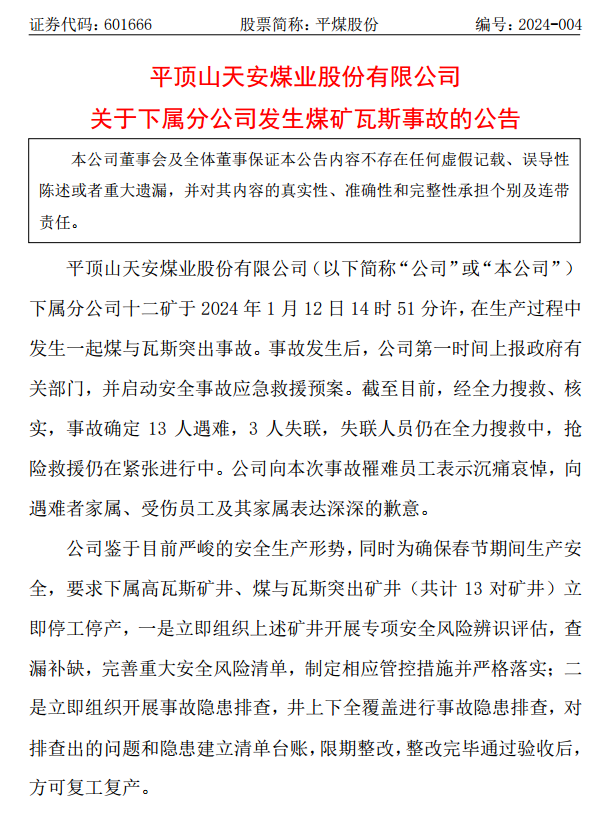 1月14日訊,平煤股份公告,下屬分公司十二礦于1月12日14時51分許,在生產過程中發(fā)生一起煤與瓦斯突出事故。截至目前,經全力搜救、核實,事故確定13人遇難,3人失聯(lián),失聯(lián)人員仍在全力搜救中,搶險救援仍在緊張進行中。