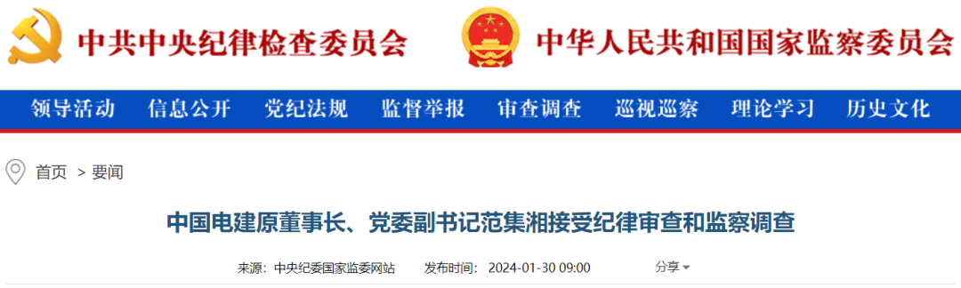 2024年1月30日,據(jù)中央紀(jì)委國(guó)家監(jiān)委駐國(guó)務(wù)院國(guó)資委紀(jì)檢監(jiān)察組、江西省紀(jì)委監(jiān)委消息:中國(guó)電建原董事長(zhǎng)、黨委副書記范集湘涉嫌嚴(yán)重違紀(jì)違法,接受中央紀(jì)委國(guó)家監(jiān)委駐國(guó)務(wù)院國(guó)資委紀(jì)檢監(jiān)察組和江西省監(jiān)委紀(jì)律審查和監(jiān)察調(diào)查。